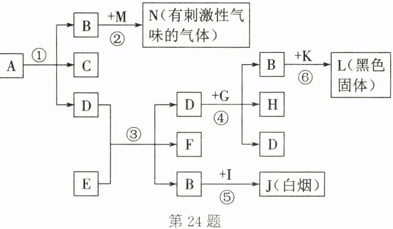 24.(10分)下列是我们学过的一些物质,它们之间有如图所示的转化关系(部分反应物及反应条件已省略)。已知A为暗紫色固体,常温下E、F均为液体,B为无色、能支持燃烧的气体。请回答下列问题: