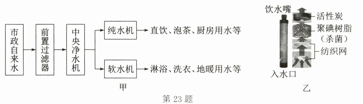 23.(6分)(2024·鄂尔多斯东胜期中)黄河水中含有大量泥沙等不溶性杂质及色素、异味、矿物质、微生物等。如图甲所示为常见的家庭全屋净水方案。