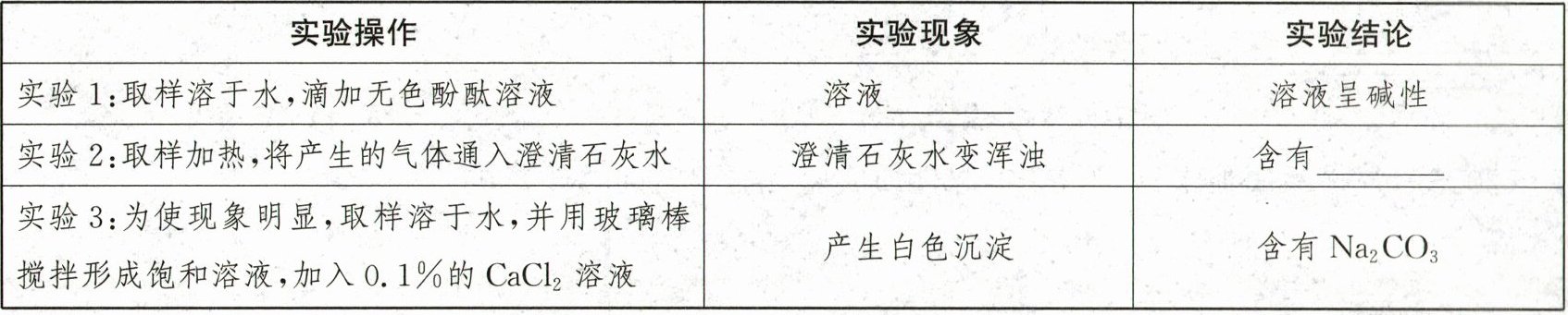 ||实验3:为使现象明显,取样溶于水,并用玻璃棒搅拌形成饱和溶液,加入0.1%的$CaCl_2$溶液|产生白色沉淀|含有$Na_2CO_3$|