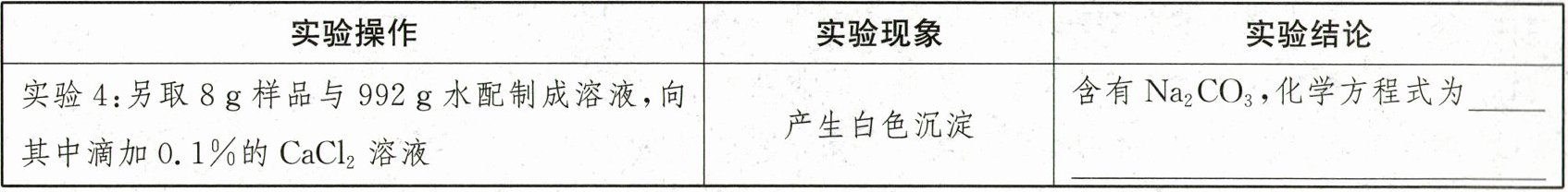 |实验4:另取8g样品与992g水配制成溶液,向其中滴加0.1%的$CaCl_2$溶液|产生白色沉淀|含有$Na_2CO_3,$化学方程式为______