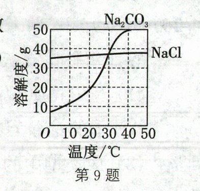 9. (2024·连云港)我国盐湖地区有"夏天晒盐(NaCl),冬天捞碱$(Na_2CO_3)"$的做法。NaCl、$Na_2CO_3$的溶解度曲线如图。下列说法正确的是(