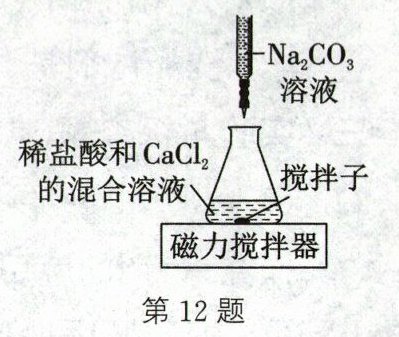 12. (2024·苏州)常温下,取少量实验室制$CO_2$的剩余溶液(稀盐酸和$CaCl_2$的混合溶液),边搅拌边滴加一定溶质质量分数的$Na_2CO_3$溶液(如图),产生无色气体,白色沉淀不断增加。下列有关说法正确的是(
