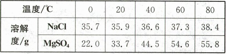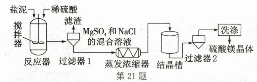 21. (5分)(2024·湖北)某工厂在粗盐的提纯过程中产生了大量的"盐泥"[主要成分为$Mg(OH)_2、$$BaSO_4$和NaCl]。利用"盐泥"制备硫酸镁晶体的工艺流程如图所示。已知:两种物质在不同温度时的溶解度如表。