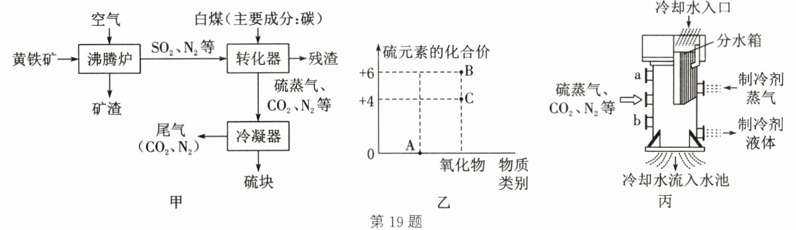 19. (10 分)图甲是工业上利用黄铁矿(主要成分为$FeS_{2}$)制取硫的流程图,图乙是硫元素的价类二维图。请回答:(已知:沸腾炉中的主要反应为$4FeS_{2}+11O_{2}\frac {\underline {{高温}}}{}2Fe_{2}O_{3}+8SO_{2}$)