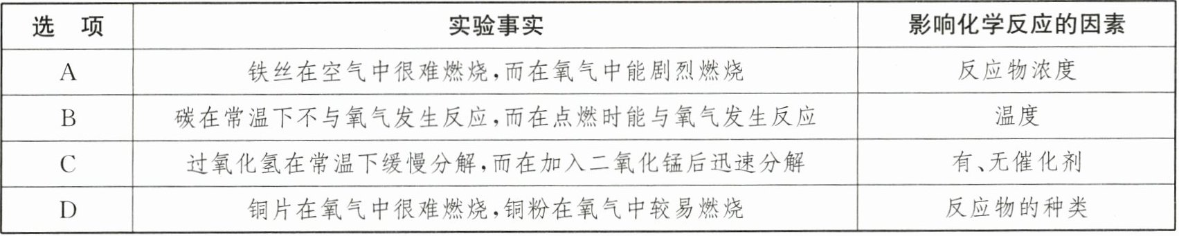D 解析:铁丝在空气中很难燃烧,而在氧气中能剧烈燃烧,说明化学反应的难易与反应物浓度有关;碳在常温下不与氧气发生反应,而在点燃时能与氧气发生反应,说明温度影响化学反应的进行;过氧化氢在加入二氧化锰后迅速分解,说明催化剂能加快过氧化氢的分解,A、B、C项的推理均合理。铜片在氧气中很难燃烧,铜粉在氧气中较易燃烧,是因为铜粉与氧气的接触面积比铜片与氧气的接触面积大,铜片与铜粉是同一种物质,D项的推理不合理。故本题选D。