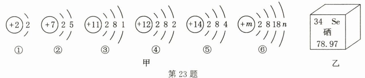 23.(7分)(2024·扬州宝应期末)"宏观—微观—符号"三重表征是化学独特的表示物质及其变化的方式。嫦娥五号探测器携带月壤样本返回地球,经分析得出月壤含有He、N、Na、Mg、Si、Se等元素。图甲是上述六种元素对应的原子结构示意图,图乙是硒元素在元素周期表中的信息。回答下列问题: