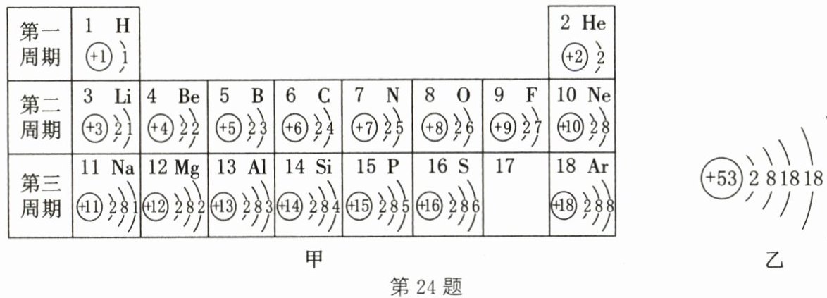 ⑤如图乙所示为碘元素的______(填"原子""阳离子"或"阴离子")结构示意图。由图乙可知,碘元素应位于元素周期表中的第______周期。