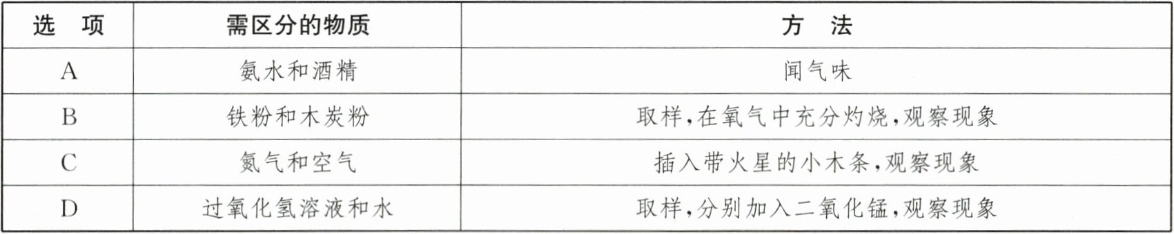 C 解析:氨水易挥发出氨气,氨气有刺激性气味,酒精有特殊香味,能用闻气味的方法区分氨水和酒精,A正确。铁粉在氧气中灼烧会剧烈反应,火星四射,产生黑色固体,木炭粉在氧气中灼烧生成二氧化碳气体,固体逐渐减少,能用灼烧的方法区分铁粉和木炭粉,B正确。氮气和空气都不能使带火星的小木条复燃,不能用带火星的小木条来区分氮气和空气,C不正确。在过氧化氢溶液中加入二氧化锰会产生大量气泡,在水中加入二氧化锰无明显现象,能用二氧化锰来区分过氧化氢溶液和水,D正确。