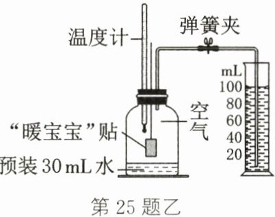 (填“吸收”或“放出”)热量。Ⅲ. 使用“暖宝宝”贴来测定空气中氧气的含量。实验开始前的装置如图乙(夹持仪器已略去)采用湿度、氧气浓度、温度传感器收集数据,将拆除包装的“暖宝宝”倒入三颈烧瓶中密封装置,开始收集数据,观察曲线变化(图中A、B、C)。