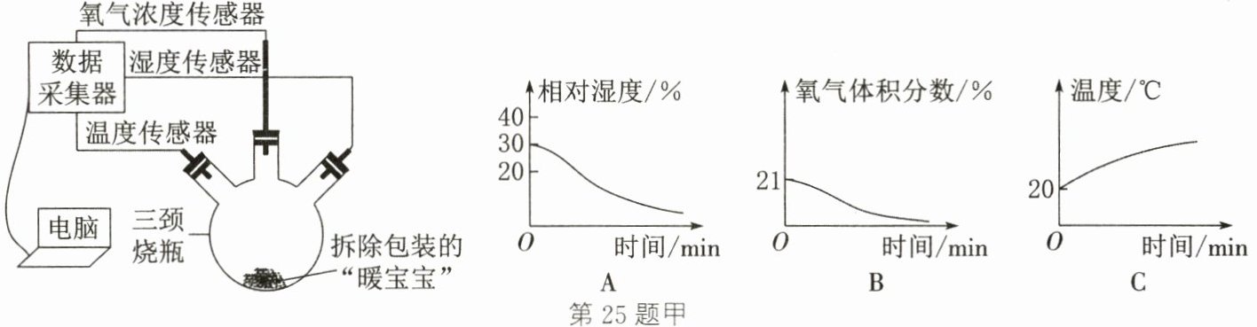 (写出操作及现象),说明黑色粉末中还有炭粉。Ⅱ. 探究“暖宝宝”发热的原理。按图甲(夹持仪器已略去)采用湿度、氧气浓度、温度传感器收集数据,将拆除包装的“暖宝宝”倒入三颈烧瓶中密封装置,开始收集数据,观察曲线变化(图中A、B、C)。