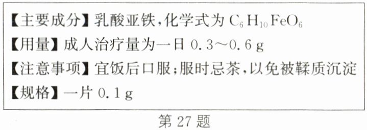 27. 乳酸亚铁片可用于治疗缺铁性贫血。如图为乳酸亚铁片说明书上的部分文字。请回答下列问题: