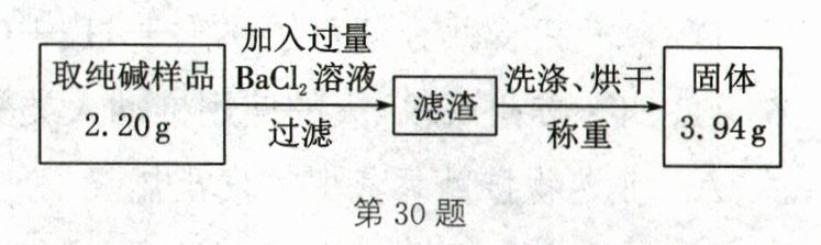 30.(6分)市售的食用纯碱中含有少量氯化钠,探究小组以某品牌食用纯碱为样品测定其中$\mathrm{Na}_{2}\mathrm{CO}_{3}$的质量分数,实验过程如图。(已知:碳酸钠的化学式为$\mathrm{Na}_{2}\mathrm{CO}_{3}$,俗称纯碱;$\mathrm{Na}_{2}\mathrm{CO}_{3}+\mathrm{BaCl}_{2}\xlongequal{\;\;}\mathrm{BaCO}_{3}\downarrow+2\mathrm{NaCl}$)