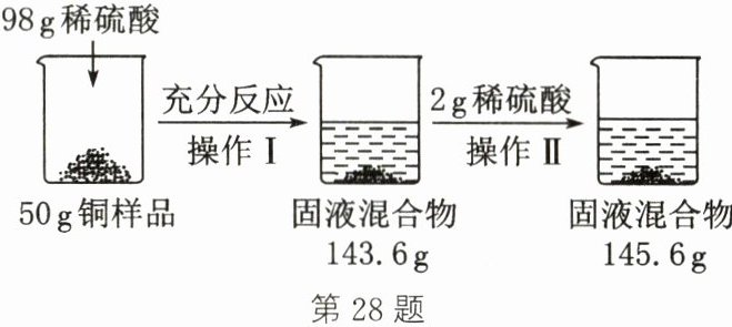 28.某兴趣小组欲除去铜样品中的铜绿[$Cu_{2}(OH)_{2}CO_{3}$],并测定$Cu_{2}(OH)_{2}CO_{3}$的质量分数,进行如图操作[仅铜绿与稀硫酸反应:$Cu_{2}(OH)_{2}CO_{3}+2H_{2}SO_{4}= 2CuSO_{4}+CO_{2}\uparrow +3H_{2}O$]。