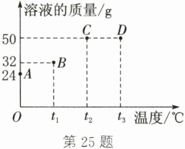 25. (6分)将30 g固体物质X(不含结晶水)投入盛有20 g水的烧杯中,搅拌,测得0℃、$t_1℃、$$t_2℃、$$t_3℃$时烧杯中溶液的质量分别如图中A、B、C、D点所示。回答下列问题: