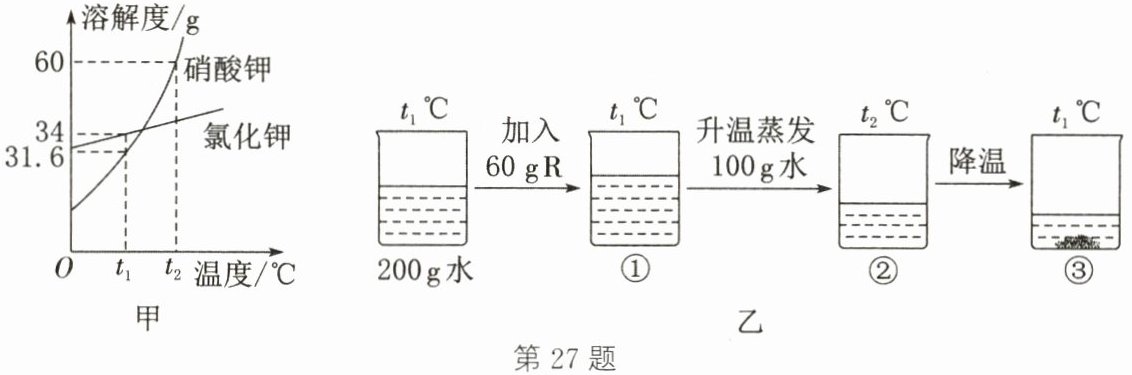 有关。(2)图甲为硝酸钾和氯化钾的溶解度曲线,图乙为兴趣小组进行的实验,R物质是硝酸钾或氯化钾中的一种。