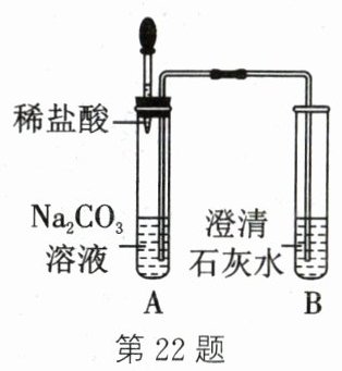 (1)${Na_{2}CO_{3} + 2HCl\xlongequal{}2NaCl + H_{2}O + CO_{2}\uparrow}$ (2)盐酸与碳酸钠反应生成了二氧化碳气体,试管内气体增多,压强增大,将A中的溶液压入B中 (3)${CaCO_{3}}$