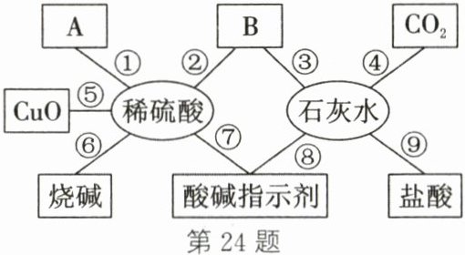 24. (6分)某实验中学的同学归纳总结出有关酸和碱的化学性质的知识网络如图(如图所示)。其中A是目前世界年产量最高的金属,B是一种常见的化合物,图中短线表示相连的两种物质在一定条件下可以发生化学反应。请根据图示回答有关问题。
