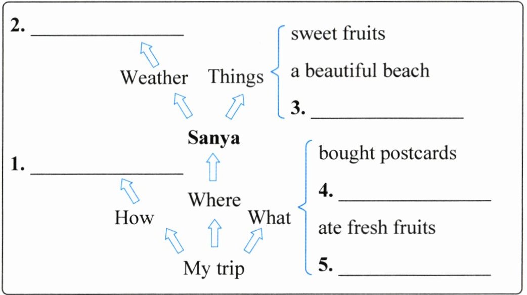 1. by plane 2. sunny but hot 3. pretty flowers 4. went swimming 5. went boating