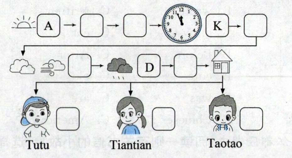 上两行按导图顺序:E C F B J 最后一行:Tutu-G Tiantian-H Taotao-I