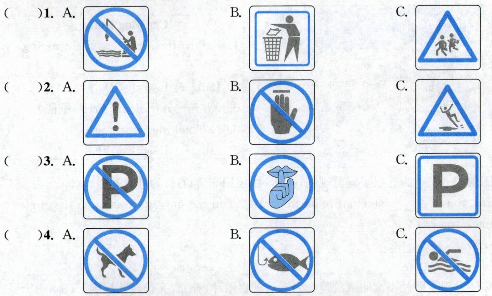 一、亮亮将平时外出看到的标识整理成图片向小组成员介绍。听两遍录音,选出与介绍内容相符的标识。(4 分)