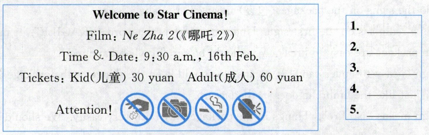 三、亮亮和图图去看电影时发现电影海报上也有一些标识。听两遍录音,判断所听句子与电影海报是(T)否(F)相符。(10 分)