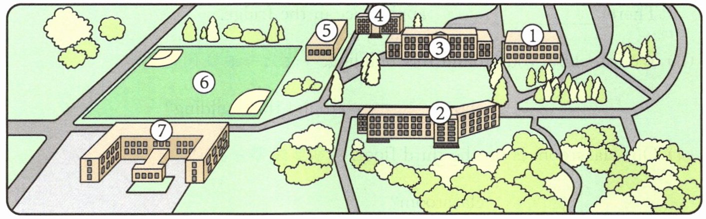 ① Dining Hall ② Library ③ Teaching Building ④ Teaching Building ⑤ Indoor Stadium(室内体育馆) ⑥ Playground ⑦ Art Building