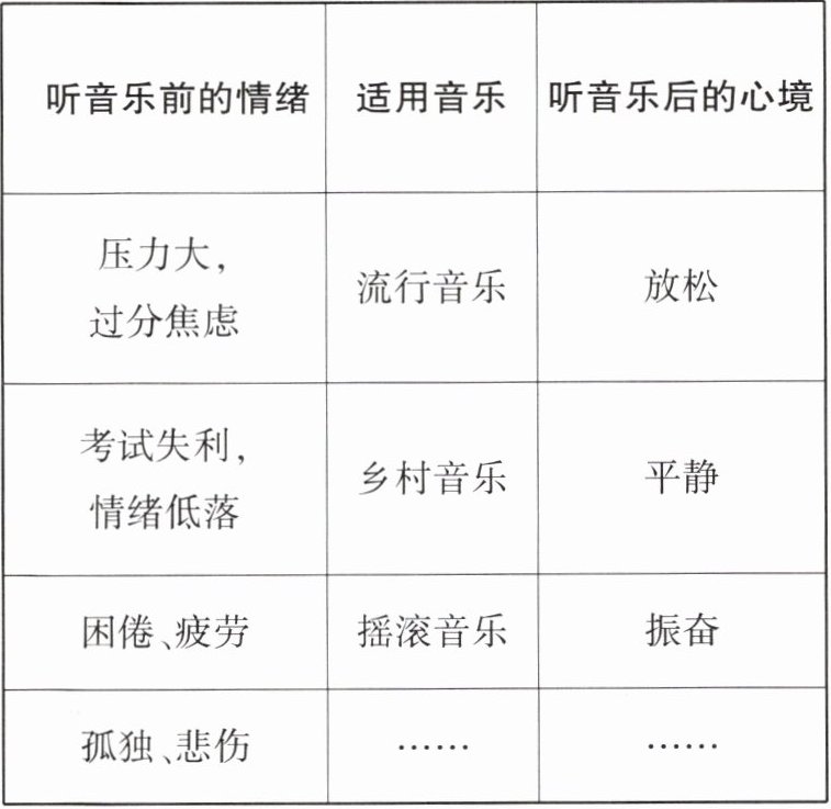 研究表明音乐对人们的情绪有着重要的影响,因此人们用不同的音乐来调节心情。请根据下表提示内容,写一篇英语短文,词数100左右(开头已给出,不计入总词数)。