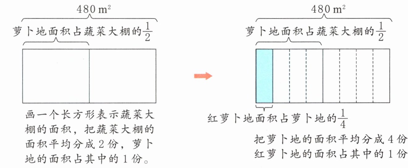 方法二:先求出红萝卜地的面积占整个蔬菜大棚面积的几分之几,再求出红萝卜地的面积。