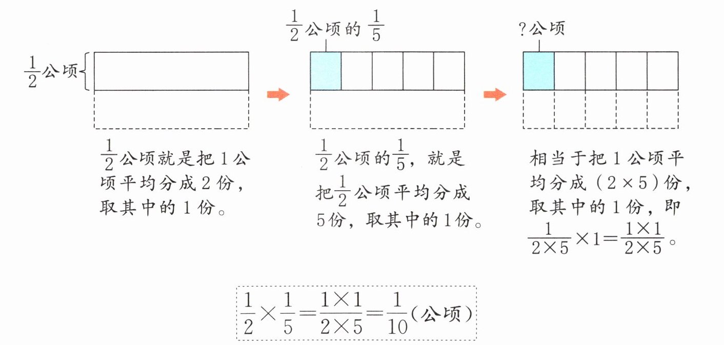 一块地的面积是$\frac{1}{2}$公顷,这块地的$\frac{1}{5}$种土豆,是把这块地的面积看作单位“1”。求种土豆的面积,是求$\frac{1}{2}公顷的\frac{1}{5}$是多少,用乘法计算,列式为$\frac{1}{2} × \frac{1}{5}$。