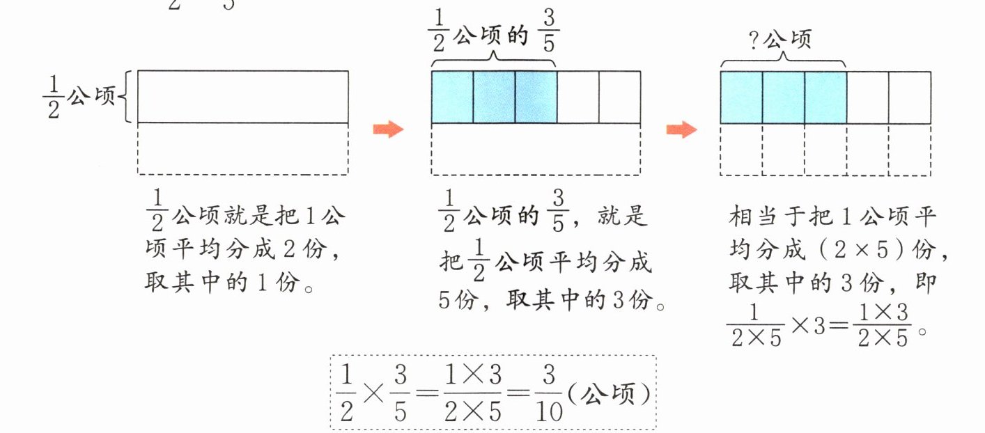 例题: 李伯伯家有一块$\frac{1}{2}$公顷的地。这块地的$\frac{1}{5}$种土豆,$\frac{3}{5}$种玉米。