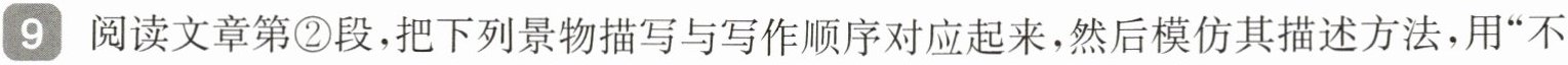9 阅读文章第②段,把下列景物描写与写作顺序对应起来,然后模仿其描述方法,用“不必说……也不必说……单是……就……”的句式写一段话。