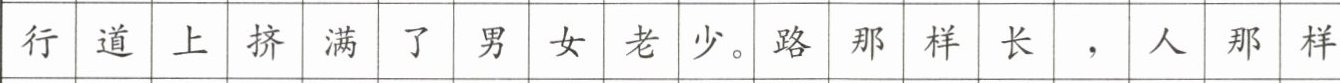 | 行 | 道 | 上 | 挤 | 满 | 了 | 男 | 女 | 老 | 少 | 。 | 路 | 那 | 样 | 长 | , | 人 | 那 | 样 | 多 |