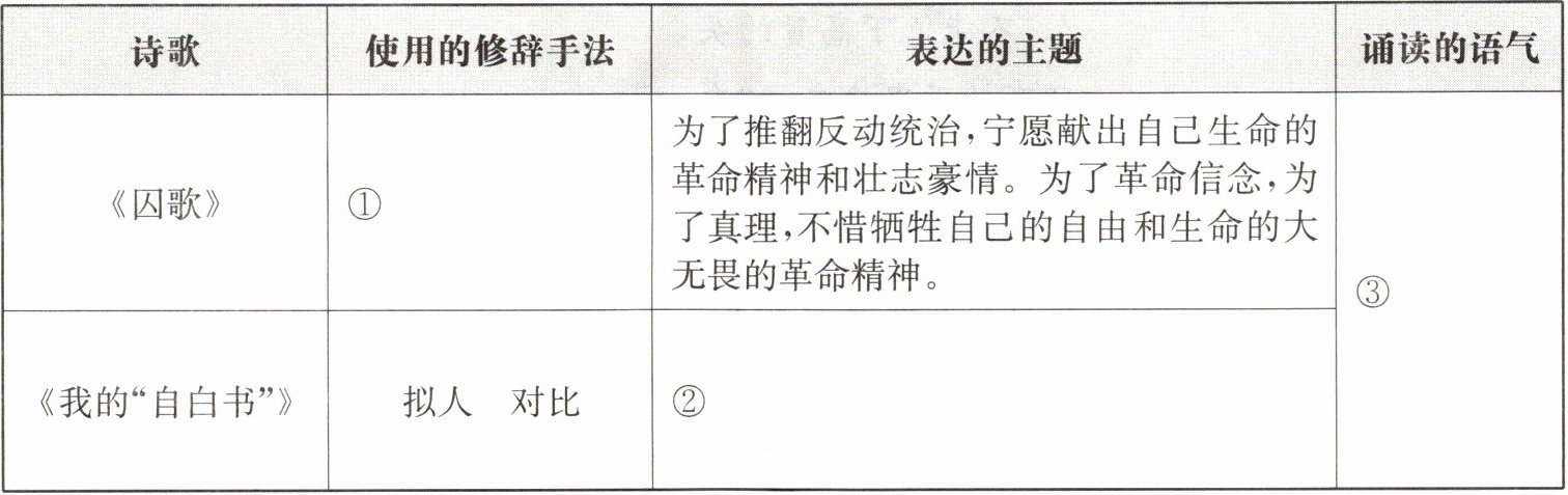 | 《囚歌》 | ① | 为了推翻反动统治,宁愿献出自己生命的革命精神和壮志豪情。为了革命信念,为了真理,不惜牺牲自己的自由和生命的大无畏的革命精神。 | ③ |