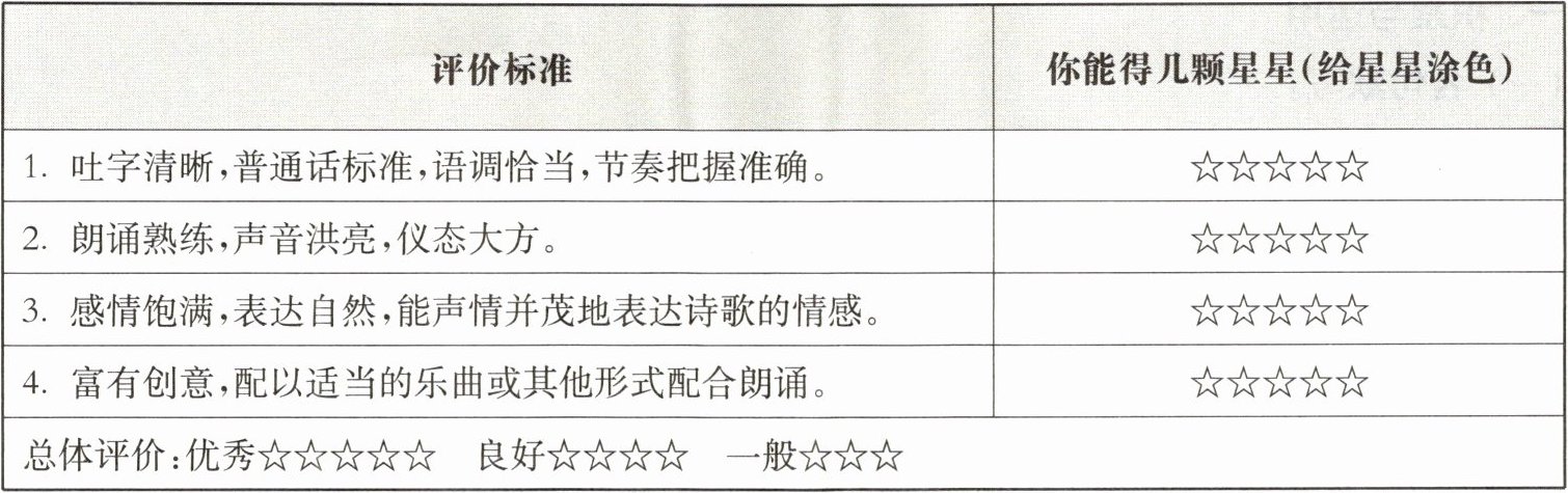 | 3. 感情饱满,表达自然,能声情并茂地表达诗歌的情感。 | ☆☆☆☆☆ |