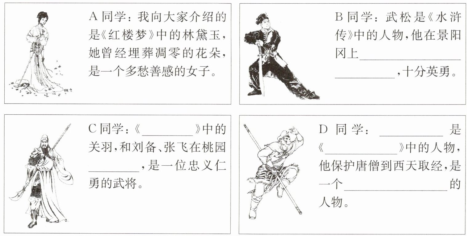 ||C同学:《 》中的关羽,和刘备、张飞在桃园 ,是一位忠义仁勇的武将。||D同学: 是《 》中的人物,他保护唐僧到西天取经,是一个 的人物。|