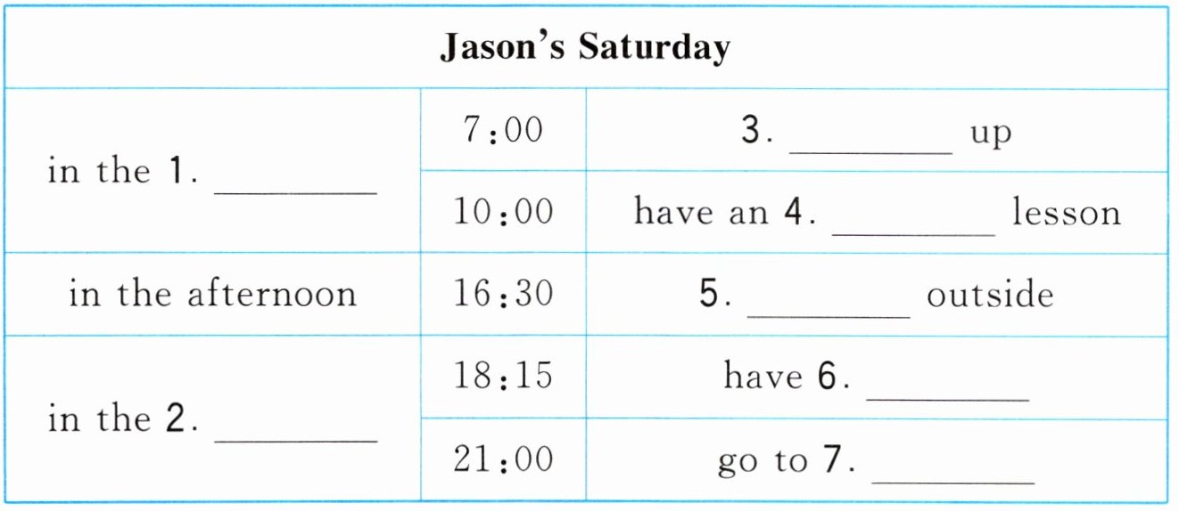 1.morning 2.evening 3.get 4.Art 5.play 6.dinner 7.bed