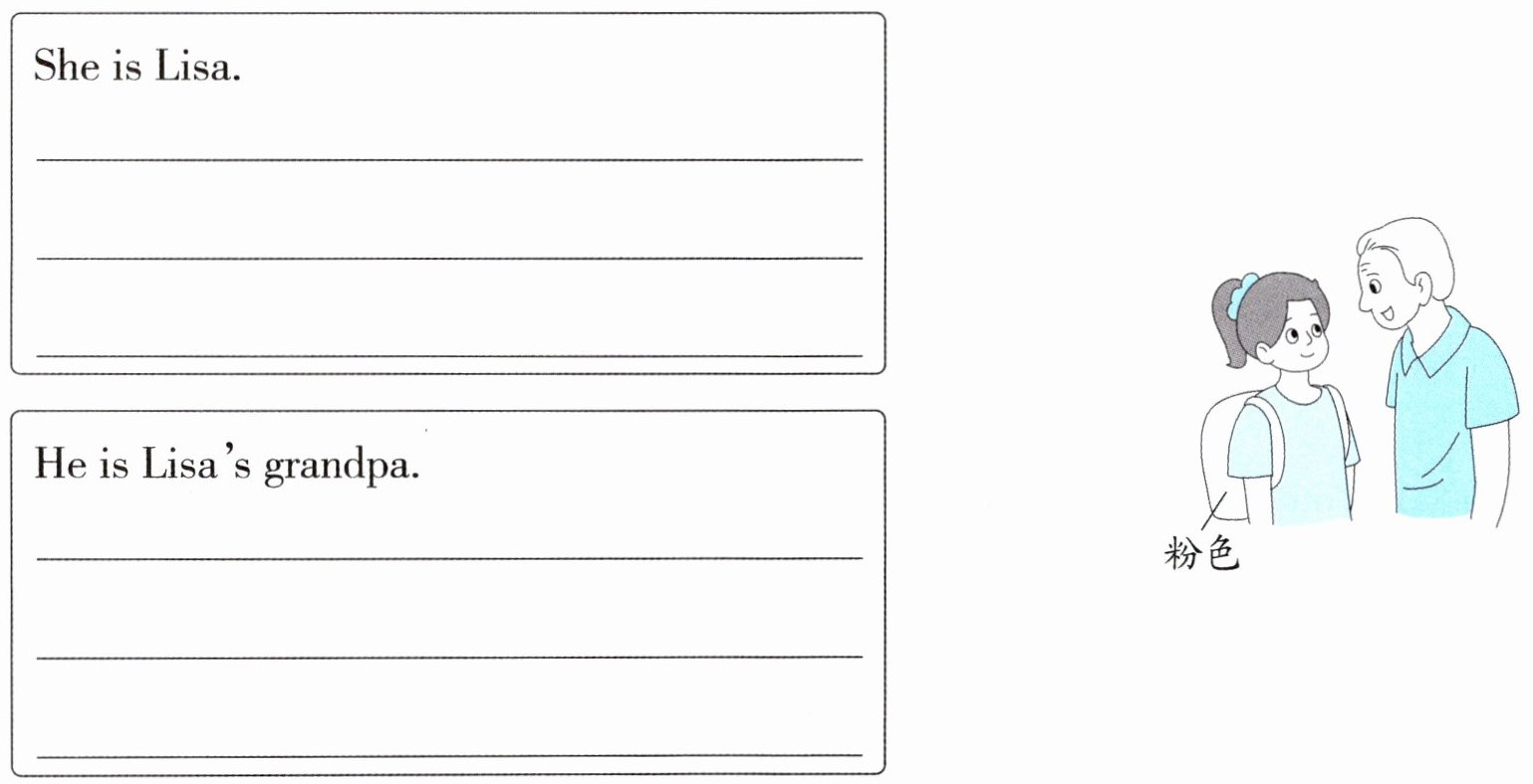 二、She is Lisa. Her eyes are big. She has long hair. She has a pink schoolbag. He is Lisa's grandpa. He's old. His mouth is big. His hair is white.(答案不唯一)
