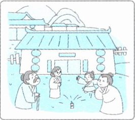 The next day was Chinese New Year. The people came out of their houses. They looked around. They saw lots of red things. "The monster is afraid of big noise and red things!" the people said. People were very happy and said, "Every year we will wear red clothes. Then the monster won't come again." So every Chinese New Year's Eve, people all put on new hats and new clothes and lit firecrackers. And they went to see their families and friends.