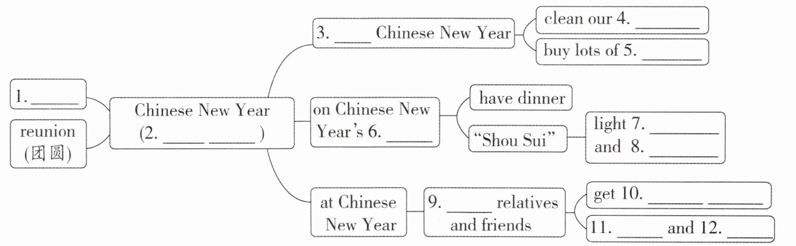 1.love 2.Spring Festival 3.before 4.houses 5.food 6.Eve 7.fireworks 8.firecrackers 9.visit 10.red packets 11.eat 12.talk
