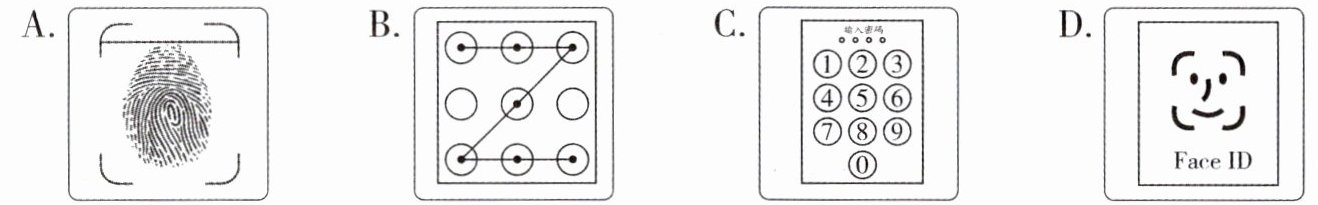 解析:根据常识,图案解锁是通过连接多个点形成特定图案来解锁,选项B的图案符合这一特征。