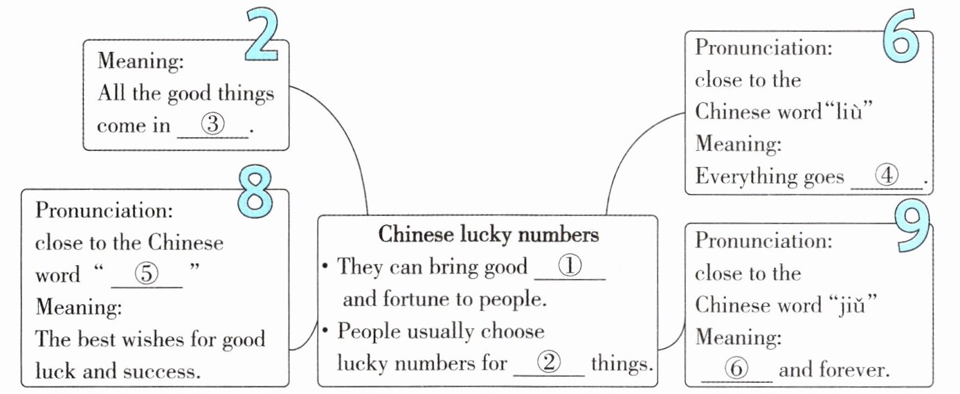 1.①luck ②important ③pairs ④well ⑤fā ⑥Long 2.好事成双。3.For example,Father sends the message "520" to Mother to show love.4.People should work hard all the time to live a happy life.