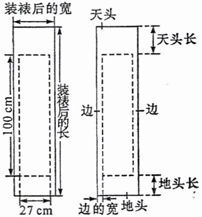 14. (2023·北京)对联是中华传统文化的瑰宝,对联装裱后,如图所示,上、下空白处分别称为天头和地头,左、右空白处统称为边. 一般情况下,天头长与地头长的比是6:4,左、右边的宽相等,均为天头长与地头长的和的$\frac{1}{10}$. 某人要装裱一副对联,对联的长为100cm,宽为27cm. 若要求装裱后的长是装裱后的宽的4倍,求边的宽和天头长.