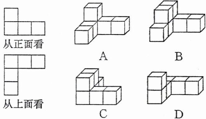 14. (2024·太原期中)小明用几个大小相同的小正方体搭成一个几何体,并画出“从正面和上面看到的这个几何体的形状图”来描述它的特征(如图).同学们仅仅依据小明的描述搭出四个几何体,其中不符合小明描述的是(