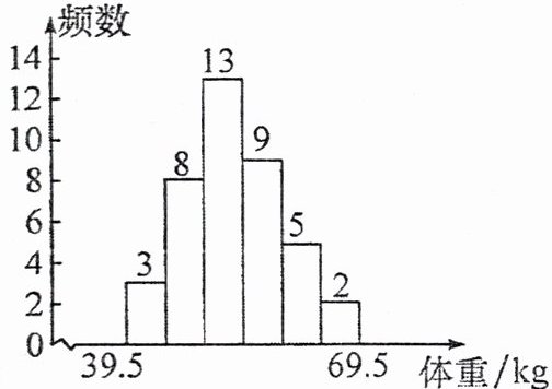 6. 某班 40 名学生体重的频数直方图(不完整)如图所示,组距为