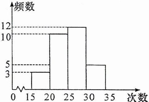 4. 国家近年来出台了一系列加强中学生体育锻炼的措施. 某校在七年级举办了趣味体育活动,其中一项活动是比较参赛选手 1 分钟内将乒乓球用球拍颠到指定高度的次数. 小明负责记录,并将结果绘制成如图所示的频数直方图,则颠球次数在 15~20 的人数占总参赛人数的百分比是(