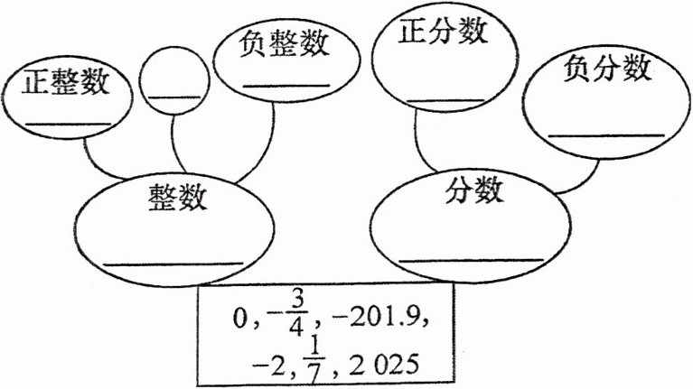 【解析】:整数包括正整数、0、负整数;分数包括正分数、负分数。所给数中,正整数为2025;0是整数;负整数为-2;正分数为1/7;负分数为-3/4、-201.9。
