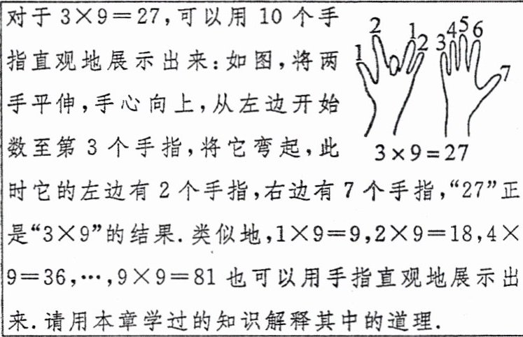 (3)设从左边开始数至第$n$个手指($0<n<10$,且$n$为正整数),将它弯起,则它的左边有$(n-1)$个手指,它的右边有$(10-n)$个手指,此时双手手指表示的运算结果为$10(n-1)+(10-n)=10n-10+10-n=9n$.所以,这种方法合理.