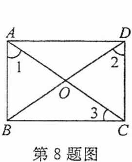 8. 如图,在$□ ABCD$中,下列条件:①$AC = BD$;②$\angle 1+\angle 3 = 90^{\circ}$;③$OB=\frac{1}{2}AC$;④$\angle 1=\angle 2$。其中能判定$□ ABCD$是矩形的有(