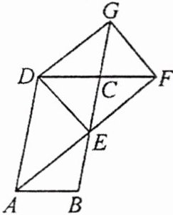 11. 如图,在$□ ABCD$中,$E$为边$BC$的中点,连接$AE$并延长交$DC$的延长线于点$F$,延长$EC$至点$G$,使$CG = CE$,连接$DG$,$DE$,$FG$。
