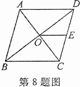 8. 如图,在菱形$ABCD$中,对角线$AC$,$BD$相交于点$O$,$E$为$CD$的中点。若$OE = 3$,则菱形$ABCD$的周长为